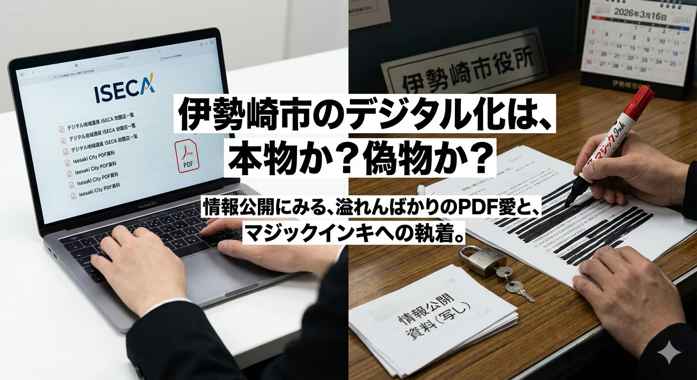 伊勢崎市のホームページを眺めていると、至る所にPDFが並んでいます。デジタル地域通貨「ISECA(イセカ)」の加盟店名簿から各種計画書まで、役所側はPDFを多用し、いかにもデジタル化が進んでいるような「大好き」な顔を見せています。しかし、市民が情報公開制度を利用して資料を請求した途端、その表情は一変します。「電子メールによる請求はできません」「紙のコピー代を払ってください」という、デジタル「大嫌い」な拒絶が待っているのです。